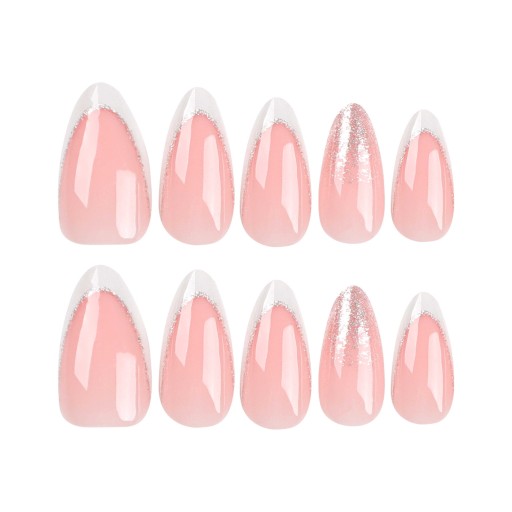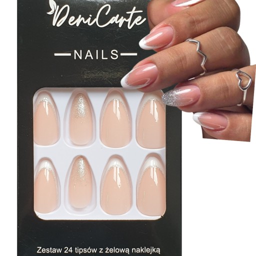 PAZNOKCIE SZTUCZNE TIPSY ALMOND FRENCH SREBRNE SAMOPRZYLEPNE 24SZT