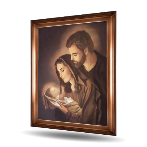 Odkryj wspaniały obraz przedstawiający świętą rodzinę - małego Jezusa, Matkę Maryję i opiekuna Józefa.