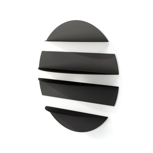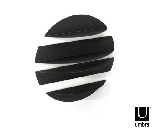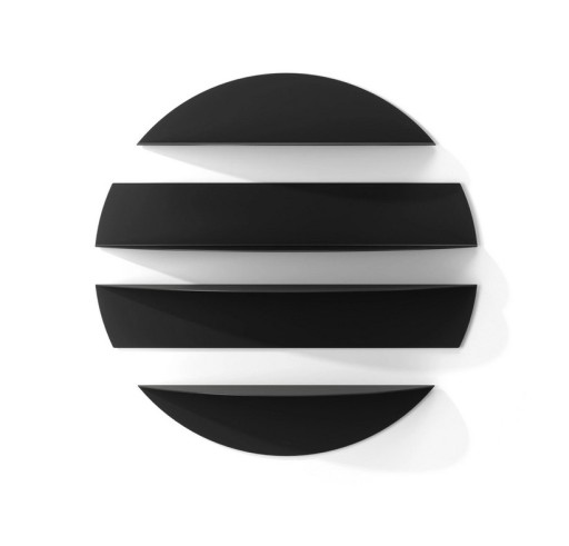 Półki ścienne Umbra Solis. Zestaw czterech wyjątkowych półek ściennych jest wykonany z wypukłego metalu i może być używany razem, aby stworzyć przyciągającą wzrok ekspozycję ścienną, która służy również jako miejsce do przechowywania Składa się z dwóch dużych i dwóch mniejszych półek, każda półka może być montowana osobno lub umieszczona razem i dowolnie zamontowana powierzchnią półki skierowaną w górę lub w dół. Nośność małej półki wynosi 4,5 kg, a dużej 6,8 kg. Wymiary: wys 76 cm / szer 76 cm / gł 18,5 cm Waga netto: 22 kg