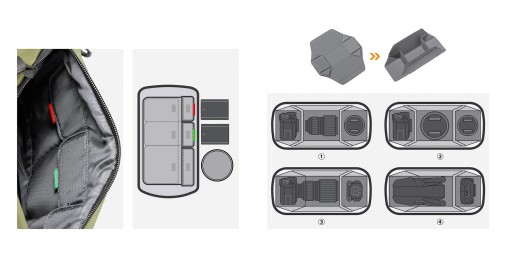 W zestawie z torbą fotograficzną K&F Concept Alpha Sling Bag 10 l - znajdziesz wyjmowaną przegródkę. Wykonane z solidnych materiałów akcesorium ułatwi organizację przestrzeni. Z jej pomocą podzielisz wnętrze torby na 2 lub 3 części, w zależności od tego, jaki towarzyszy Ci sprzęt. Przegródka to również dodatkowe wzmocnienie torby i jeszcze lepsza ochrona przenoszonych urządzeń. Oto przykład tego, co może pomieścić torba K&F Concept Alpha Sling Bag 10 l:
