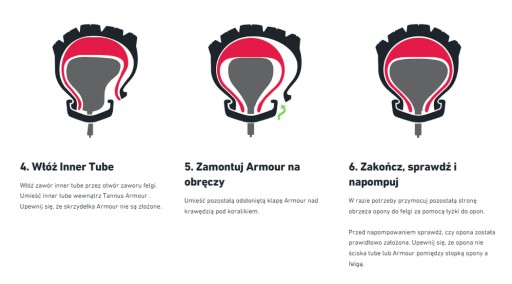 - Montaż Tannus Armour jest prosty i wymaga tylko zamiany standardowej dętki na mniejszą. Dostosowując się do różnych szerokości opon, wkładka ta jest wszechstronna, choć w niektórych przypadkach może wymagać przycięcia, by idealnie pasować i nie przemieszczać się podczas jazdy (na wkładkach zaznaczona jest linia do docięcia).