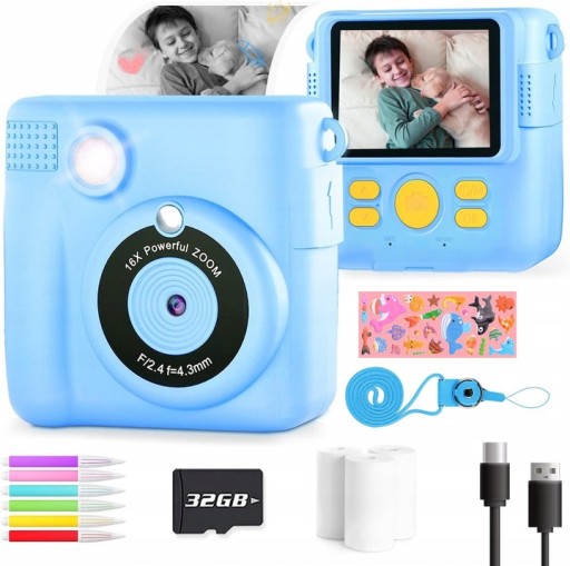 - Ten aparat dla dzieci oferuje natychmiastowe drukowanie, duży ekran o przekątnej 2,4 cala, wideo 1080P, 16-krotny zoom cyfrowy, lampę błyskową, fotografowanie poklatkowe, zdjęcia seryjne, gry, ramki filtrów, pliki MP3 i wiele innych.