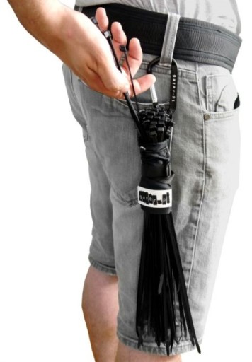 Wyposażony w dwa ściągające paski, które trzymają trytki w jednym miejscu, skutecznie zapobiega ich gubieniu. Pierwszy pasek to rozciągliwa, gumowa linka, która automatycznie naciągnie średnicę torby zaraz po zaciśnięciu. Zabezpieczona została metalowym oczkiem, który nie zniszczy torebki. Drugi pasek jest szerszy, poliestrowy o długości 15 mm, który reguluje średnicę torby i posiada blokadę przed ewentualnym rozciągnięciem. Dzięki niemu uchwyt można przewlec przez pasek od spodni, a dołączony przez nas plastikowy karabińczyk sprawia, że w razie potrzeby możemy go również zapiąć.