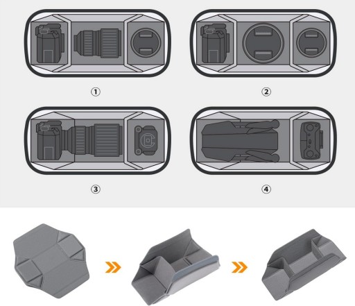 W zestawie z torbą fotograficzną K&F Concept Alpha Sling Bag 10 l znajdziesz wyjmowaną przegródkę. Wykonane z solidnych materiałów akcesorium ułatwi organizację przestrzeni. Z jej pomocą podzielisz wnętrze torby na 2 lub 3 części, w zależności od tego, jaki towarzyszy Ci sprzęt. Przegródka to również dodatkowe wzmocnienie torby i jeszcze lepsza ochrona przenoszonych urządzeń. Oto przykład tego, co może pomieścić torba K&F Concept Alpha Sling Bag 10 l: