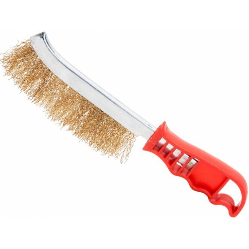 Wykonana z karbowanego mosiężnego drutu oprawionego w metalowy uchwyt ręczna szczotka z plastikową rękojeścią.