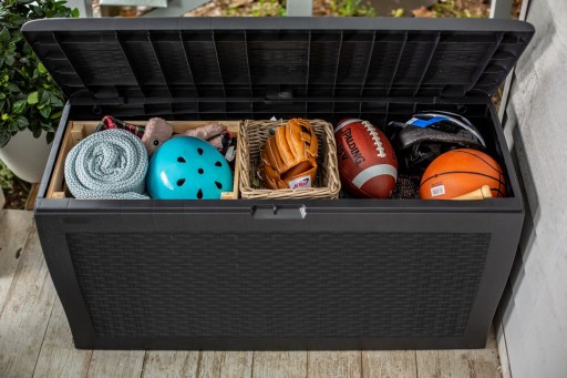 Cechy- Idealna do stosowania w ogrodzie, na tarasie, patio, czy na balkonie- Doskonały schowek na poduszki i akcesoria ogrodowe- Odporna na szkodliwe warunki atmosferyczne i promieniowanie UV- Wbudowane uchwyty i rolki ułatwiają przemieszczanie- Łatwy i szybki montaż- Pojemność: 270 litrów
