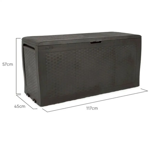 Doskonały schowek na poduszki i akcesoria ogrodowe Mocna i wytrzymała skrzynia, pięknie zaprojektowana i estetycznie wykończona Faktura powierzchni przypominają naturalny splot rattanowy.Odporna na szkodliwe warunki atmosferyczne i promieniowanie UV Nie wymaga konserwacji Wbudowane uchwyty i rolki ułatwiają przemieszczanie nawet przy wewnętrznym obciążeniu schowka.Łatwy i szybki montaż ? bez użycia narzędzi Produkt bardzo łatwy w utrzymaniu w czystości.