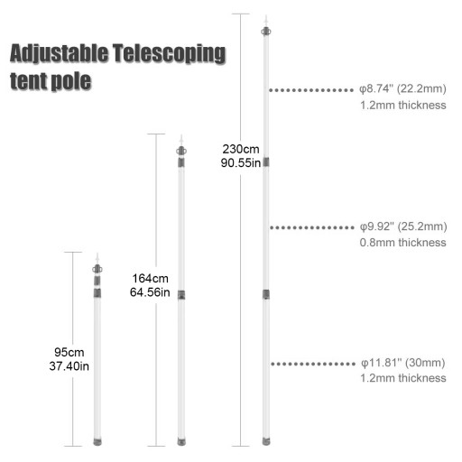 Zewnętrzne średnice trzech sekcji aluminiowych słupów to: 1 średnica zewnętrzna 30mm, 2 średnica zewnętrzna 25mm, 3 średnica zewnętrzna 21mm, wysuwana długość: najkrótsza 0,9m~ najdłuższa 2,3m.