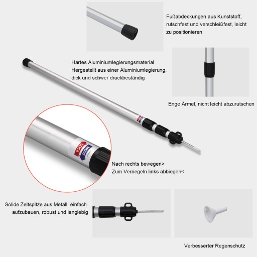Łatwy do przechowywania, wyposażony w torbę plandekową i osłonę przeciwdeszczową, aby znacznie poprawić praktyczność, profesjonalnie stosowany w dużych namiotach nieba, wysoka odporność na wiatr, elastyczny, długość produktu wynosi 90-230 cm z 3 sekcjami, średnica zewnętrzna słupa namiotu wynosi 21-30 mm.