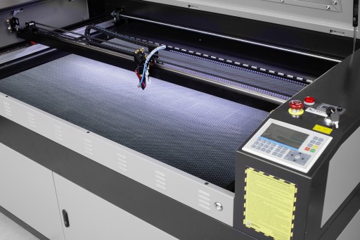 Maszyna standardowo wyposażona m.in. w przemysłową chłodnice wody S&A, system air assist, elektrycznie opuszczany stół, wyciąg spalin oraz czerwony punkt służący do lokalizacji miejsca cięcia.