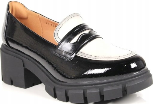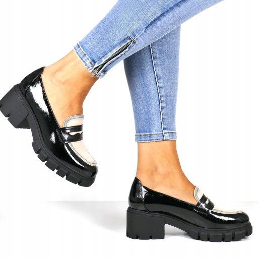 CZARNE BUTY DAMSKIE NA PLATFORMIE MOKASYNY LAKIEROWANE NA GRUBEJ PODESZWIE LOAFERSY