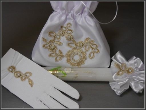 Torebka komunijna idealna do alby, wykonana z satyny atłasowej odszyta na matową stronę z atłasowym sznureczkiem. Ozdobiona złotą koronkową aplikacją.