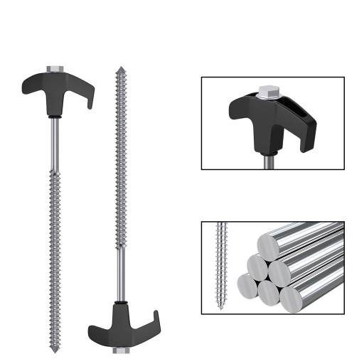 Całkowita długość szpilki namiotowej wynosi ok. 25 cm (10 cali), a grubość gwintu wynosi ok. 8 mm Ø, co jest bardzo mocne. Zapewnia maksymalną stabilność i zabezpiecza namiot nawet w trudnych warunkach pogodowych.