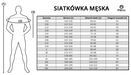 Komplet siatkarski dostępny w 7 rozmiarach seniorskich: S, M, L, XL, XXL, 3XL, 4XL oraz 9 juniorskich: 110, 116, 122, 128, 134, 140, 146, 152, 158.