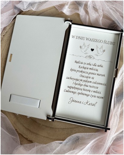 Pudełko wykonane jest z eleganckiej płyty HDF. Na zewnętrznej stronie grawerujemy imiona pary młodej oraz datę uroczystości. Natomiast w środku znajdują się życzenia wraz z podpisem osób wręczających.