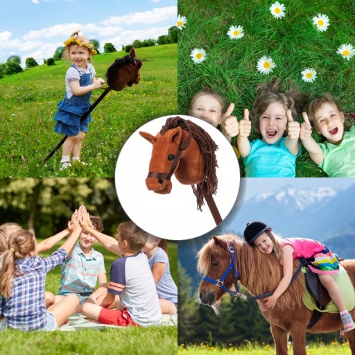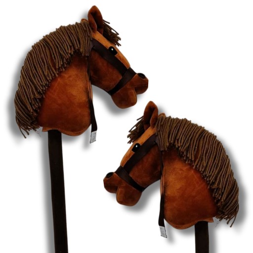 - Głowa konia na patyku wykonana jest z miękkiego materiału, a patyk z trwałego tworzywa, również pokrytego materiałem.