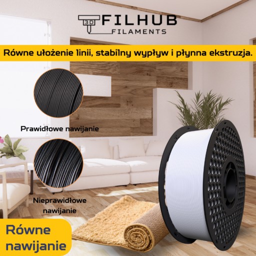 - Równe nawijanie filamentu – eliminuje ryzyko splątania i zacięć podczas drukowania;
