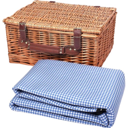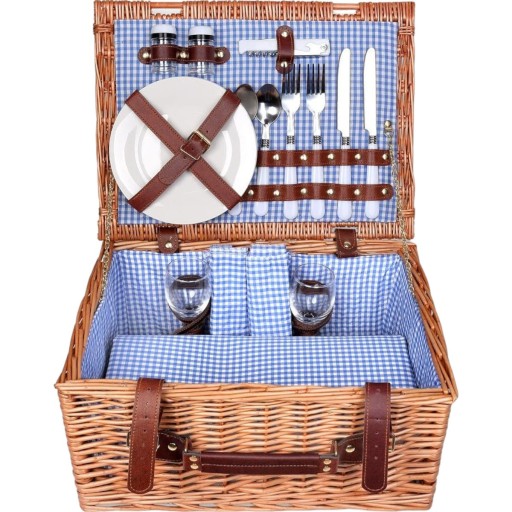 - Kompletne wyposażenie - Kosz zawiera wszystko, co potrzebne na piknik: sztućce, talerzyki, kieliszki oraz scyzoryk z otwieraczem i korkociągiem.