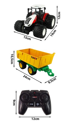 Duży traktor rolniczy na ogromnych szerokich kołach zdalnie sterowany pilotem R/C 2.4GHz z przyczepą wywrotką!