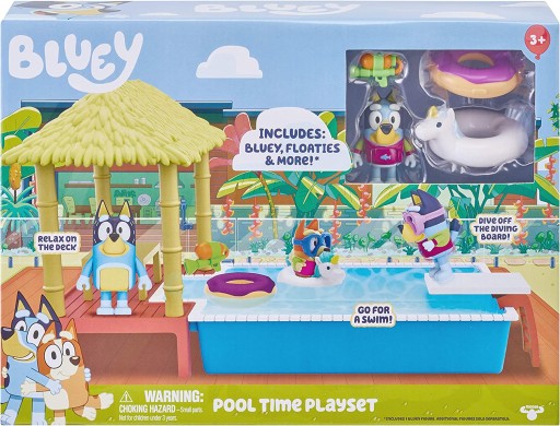 W skład zestawu wchodzi basen, figurka Bluey'a w stroju kąpielowym i inne gadżety