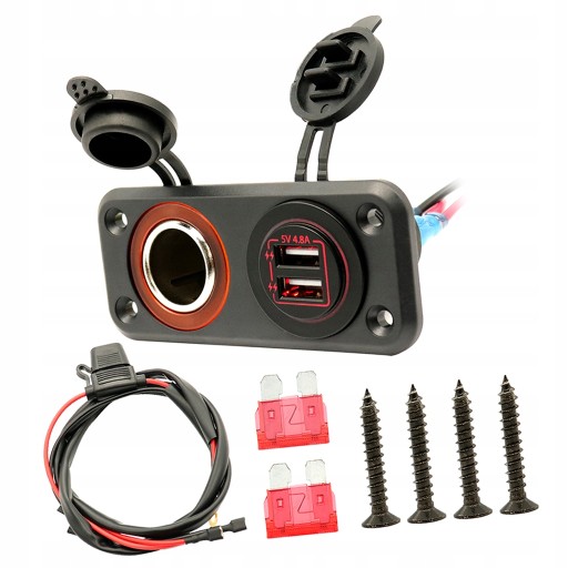 : i kompaktowa konstrukcja, wodoodporność IP65 Gniazdo USB 5 V 4,8 A szybsze niż konwencjonalne ładowarki, gniazda zapalniczki 12 V Podłączone przewody i śruby mocujące są dołączone do szybszej instalacji Podwójna ładowarka USB, idealna do ładowania telefonów, tabletów, urządzeń z systemem Android, itp Uniwersalny kompatybilny z motocyklem 12 V-24 V, samochodem, łodzią, ATV, kamperem, przyczepami kempingowymi, przyczepą podróżną itp