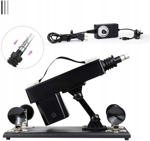 Zestaw zawiera: Sex maszyna z uchwytem i przyssawkami, zasilacz z pilotem regulującym intensywność, 3 x dildo