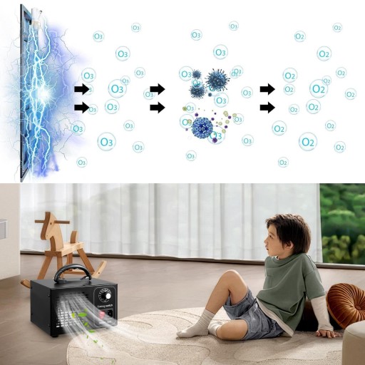 ♻️1. Skuteczny: Generator ozonu wykorzystuje mocny wentylator do szybkiego rozprowadzania ozonu po pomieszczeniu, reagując z zanieczyszczeniami i szybko przekształcając je w świeży tlen.