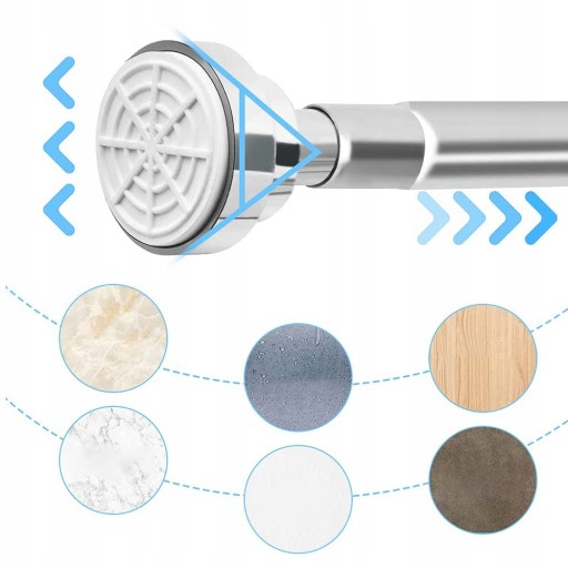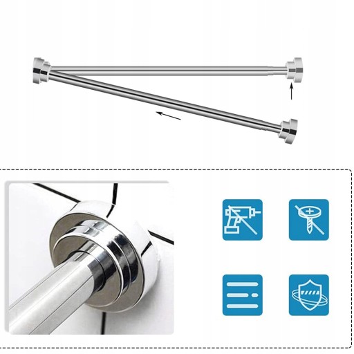 -Wbudowana sprężyna teleskopowego karnisza prysznicowego i antypoślizgowa gumowa powierzchnia na końcu mogą generować ogromne napięcie i utrzymywać ciasną przestrzeń do siedzenia. Może utrzymać do 6-7 kg. Zmniejszający się rozmiar wynosi 50 cm, a najdłuższy może osiągnąć 80 cm.
