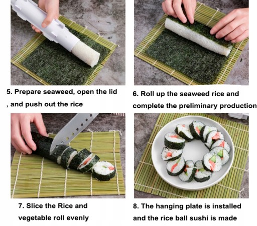 3. Łatwy w użyciu: nasz ekspres do sushi jest odpowiedni dla początkujących i musisz sam zrobić sushi. Możesz użyć naszego wałka do sushi z arkuszami japońskiego sushi nori, wodorostami, foremkami do ryżu, daniami do sushi, łódkami do sushi, tacami, talerzami i innymi akcesoriami do sushi.