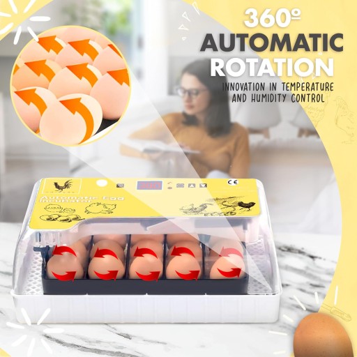 Inkubator zawiera silnik, który automatycznie obraca jaja, o różnych rozmiarach, aby równomiernie ogrzać je i lepiej inkubować.