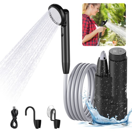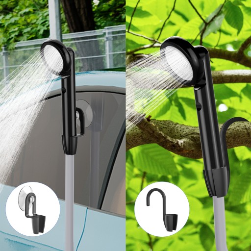 Mobilny prysznic jest wyposażony w hak typu J i przyssawki do łatwego zawieszania lub mocowania, nie są potrzebne żadne otwory. Wąż o długości 1,8 m jest w pełni dostępny dla pryszniców stojących, nie tylko do aktywności na świeżym powietrzu, takich jak podróże, kemping i wędkarstwo, ale także do podlewania kwiatów, mycia samochodów, kąpieli zwierząt domowych itp.