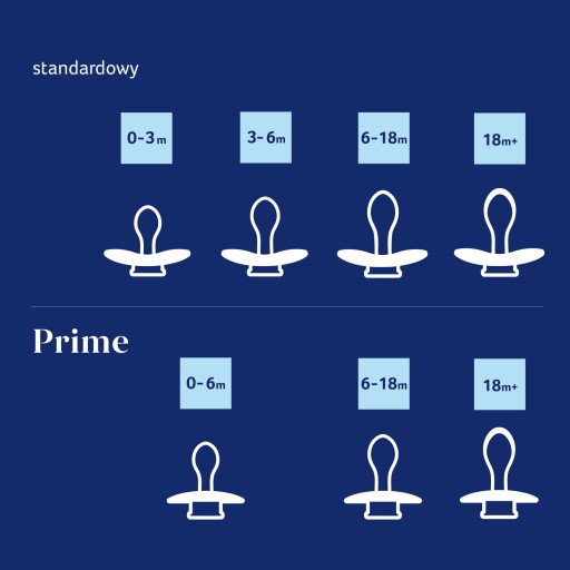 Jeśli Twoje dziecko jest w wieku 6-18 miesiące i do tej pory używało smoczka standardowego LOVI 6-18, to wybierz dla niego LOVI Prime 18m+, gdzie wielkość gumki jest taka sama, a sam silikon mocniejszy, odporniejszy na gryzienie
