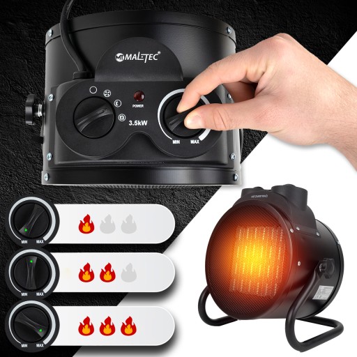 ◾ DUŻA MOC 3,5 kW ◾ REGULACJA WENTYLATORA ◾ TERMOSTAT ◾ SZYBKIE NAGRZEWANIE ◾ MAŁE ZUŻYCIE PRĄDU ◾