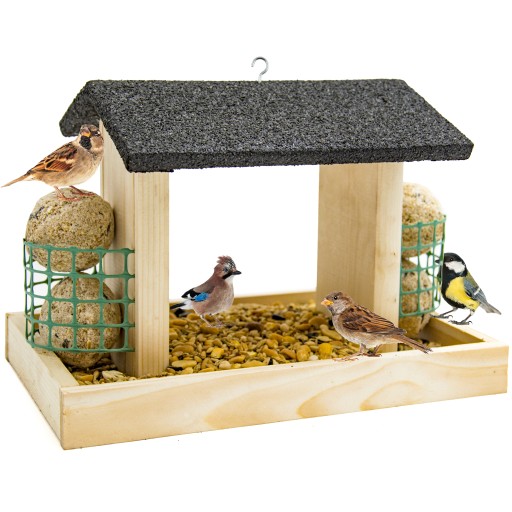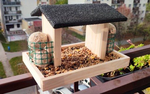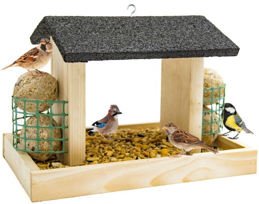 DUŻY DREWNIANY KARMNIK DLA PTAKÓW - NA KARMĘ I KULE TŁUSZCZOWE
