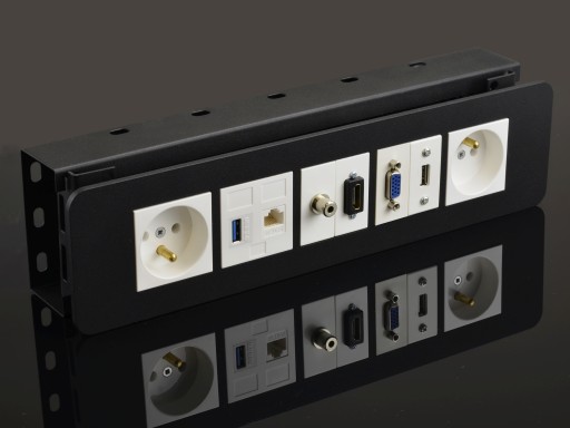 - Puszka podłogowa 4 moduły x (45x45 mm), gniazda osadzone poziomo.