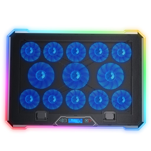- Dodatkowe funkcje: Manualny regulator obrotów wentylatorów, Boczne podświetlenie RGB - przycisk sterujący On/Off, Możliwość korzystania na kolanach