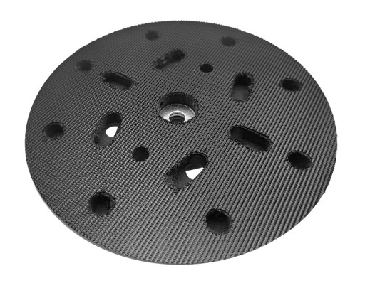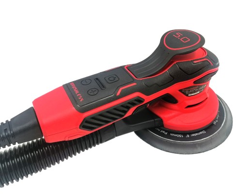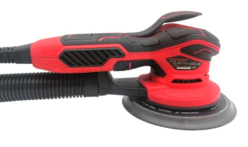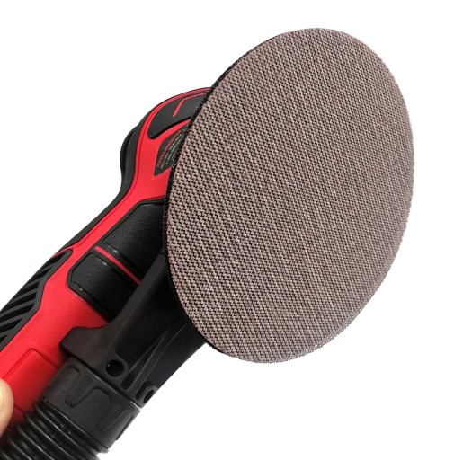 Szlifierka posiada tarczę z rzepem i otworami odpylającymi o średnicy 150 mm, która pracuje w systemie DUAL ACTION, czyli posiada dodatkową rotację, tak zwany offset o skoku 5 mm.