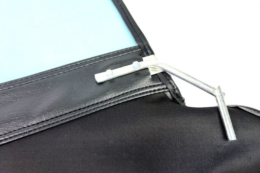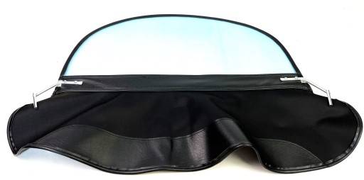 Szyba przednia z mocowaniami do gondoli wózka bocznego DUNA, stosowanego w motocyklach PANNONIA. Kolor czarny. Na innych aukcjach pozostałe elementy tapicerki tego kosza.