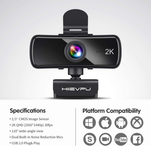 - [Kamera internetowa 2K QHD i wysoka jakość obrazu] Ta kamera internetowa 2K ma ulepszone funkcje dzięki czujnikowi obrazu CMOS, który zapewnia 4 miliony (2560 x 1440p) obrazów w wysokiej rozdzielczości i krystalicznie czyste filmy z płynną szybkością 30 klatek na sekundę. Szeroki kąt widzenia 110° i automatyczna korekcja światła nadają się do nauki online, wideokonferencji, gier, transmisji na żywo, rozmów wideo itp.