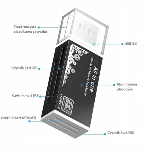 - urządzenie obsługuje wiele kart między innymi SD, SDHC, MS Pro Duo, micro SD, micro SDHC, micro SDXC, M2 i wiele innych