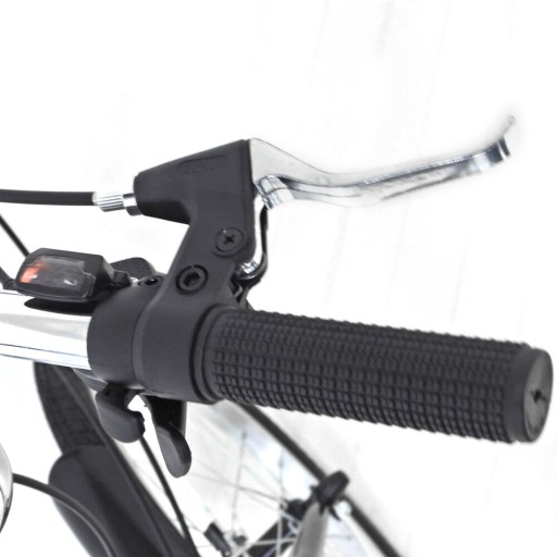 Na kierownicy roweru znajduje się wygodny uchwyt do regulacji prędkości, który umożliwia łatwe dostosowanie biegów. Dzięki temu użytkownik może precyzyjnie dopasować sprzęt do własnych preferencji, zapewniając sobie komfortową i płynną jazdę.