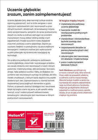 Uczenie głębokie (ang. deep learning) zyskuje ostatnio ogromną popularność. Jest to ściśle związane z coraz częstszym zastosowaniem sieci neuronowych w przeróżnych branżach i dziedzinach. W konsekwencji inżynierowie oprogramowania, specjaliści do spraw przetwarzania danych czy osoby w praktyce zajmujące się uczeniem maszynowym muszą zdobyć solidną wiedzę o tych zagadnieniach. Przede wszystkim trzeba dogłębnie zrozumieć podstawy uczenia głębokiego. Dopiero po uzyskaniu biegłości w posługiwaniu się poszczególnymi koncepcjami i modelami możliwe jest wykorzystanie w pełni potencjału tej dynamicznie rozwijającej się technologii.