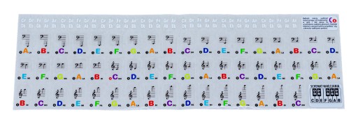 Kolorowe naklejki z przeźroczystym tłem to nieoceniona pomoc przy nauce gry. Naklejki zawierają notację C-D-E-F-G-A-B, zapis nutowy oraz DO-RE-MI-FA-SOL-LA-SI-DO.