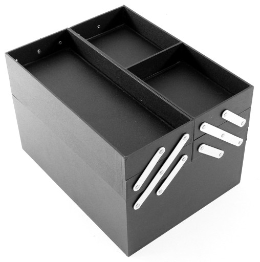 ✅ Górna część kuferka została podzielona na dwupoziomowe przegródki na drobne akcesoria.