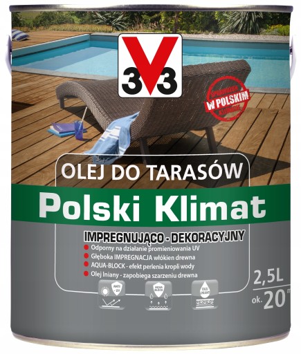 Olej V33 jest to produkt na bazie naturalnego oleju lnianego. Wnika on głęboko w drewno i zabezpiecza je przed niekorzystnym działaniem czynników atmosferycznych. Chroni i dekoruje powierzchnie tarasowe z gatunków krajowych i egzotycznych.