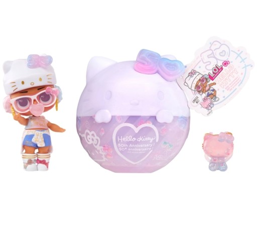 Limitowana rocznicowa edycja Hello Kitty składa się z Miss Pearly i Crystal Cutie. Obydwa maluchy są dostępne w kapsułce-niespodziance w kształcie Hello Kitty, w której znajdziesz magiczne L.O.L. Niespodzianka! Rozpakowywanie. Czeka na Ciebie siedem niespodzianek, w tym lalka w stylowym stroju z motywem Hello Kitty.