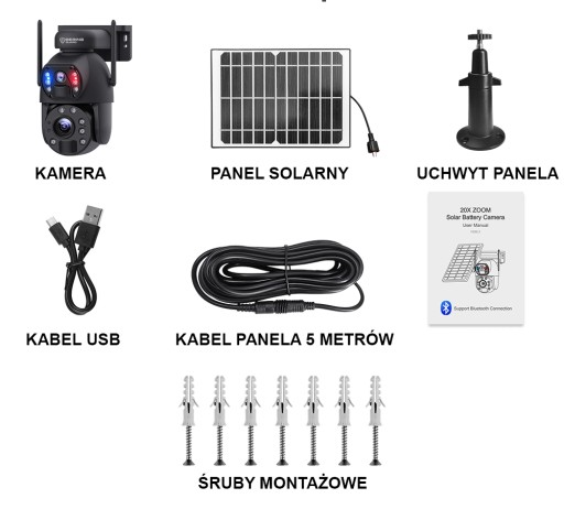 Kamera posiada w zestawie przewód łączący panel solarny z kamerą o długości 5 metrów co pozwala na zainstalowanie panelu solarnego w w miejscu gwarantującym najlepszą ekspozycję słoneczną