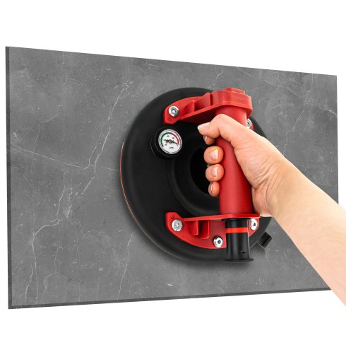 Przyssawka próżniowa cechuje się ergonimiczną budową - manometr jest w takich rozmiarach i umiejscowiony tak, żeby nie przeszkadzał podczas pracy z narzędziem.