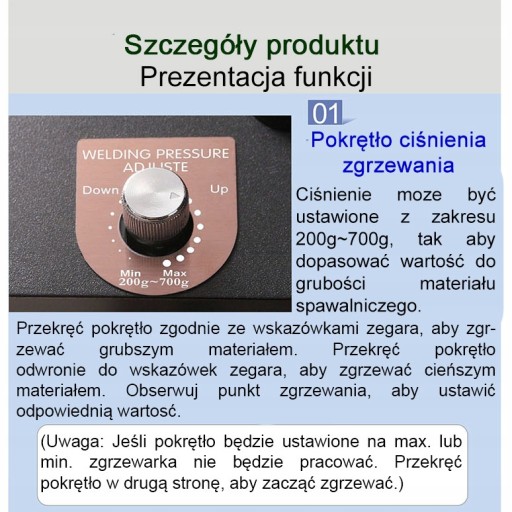 6. Podczas korzystania ze zgrzewarki mogą pojawiać się chwilowe błyski światła. Urządzenie korzysta z dużej mocy i natychmiastowo rozładowuje wysokie natężenie.