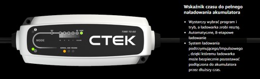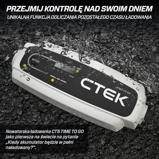 CT5 TIME TO GO firmy CTEK jest pierwszą na świecie ładowarką i zestawem do utrzymywania stanu naładowania akumulatorów wyposażoną w funkcję odliczania pozostałego czasu ładowania, która pozwala odpowiedzieć na pytanie „Kiedy akumulator będzie w pełni naładowany?”. Na wyświetlaczu jest widoczna dokładna prognoza pozostałego czasu ładowania w godzinach, wraz ze wskaźnikiem sygnalizującym możliwość bezpiecznego uruchomienia pojazdu przed całkowitym naładowaniem akumulatora. W CT5 TIME TO GO zastosowano również wbudowany czujnik temperatury gwarantujący optymalne ładowanie akumulatora, nawet w skrajnie wysokich lub niskich temperaturach otoczenia.